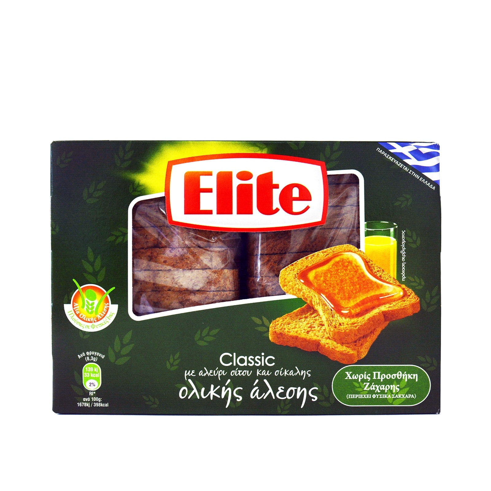 Οι κλασικές φρυγανιές Elite ολικής άλεσης αποτελούν ένα τραγανό και απολαυστικό snack για κάθε στιγμή της ημέρας. Παράγονται από αγνά υλικά και αποτελούν ιδανική λύση για το πρωινό ή συνοδευτικό για κάθε γεύμα σας. Για όλους εσάς που επιλέγετε μια ισορροπημένη διατροφή σε αλάτι και σάκχαρα, απολαύστε τις κλασικές φρυγανιές Elite Σίτου με μόνο 0,4% αλάτι ή Σίκαλης με μόνο 0,7% αλάτι, χωρίς προσθήκη ζάχαρης.