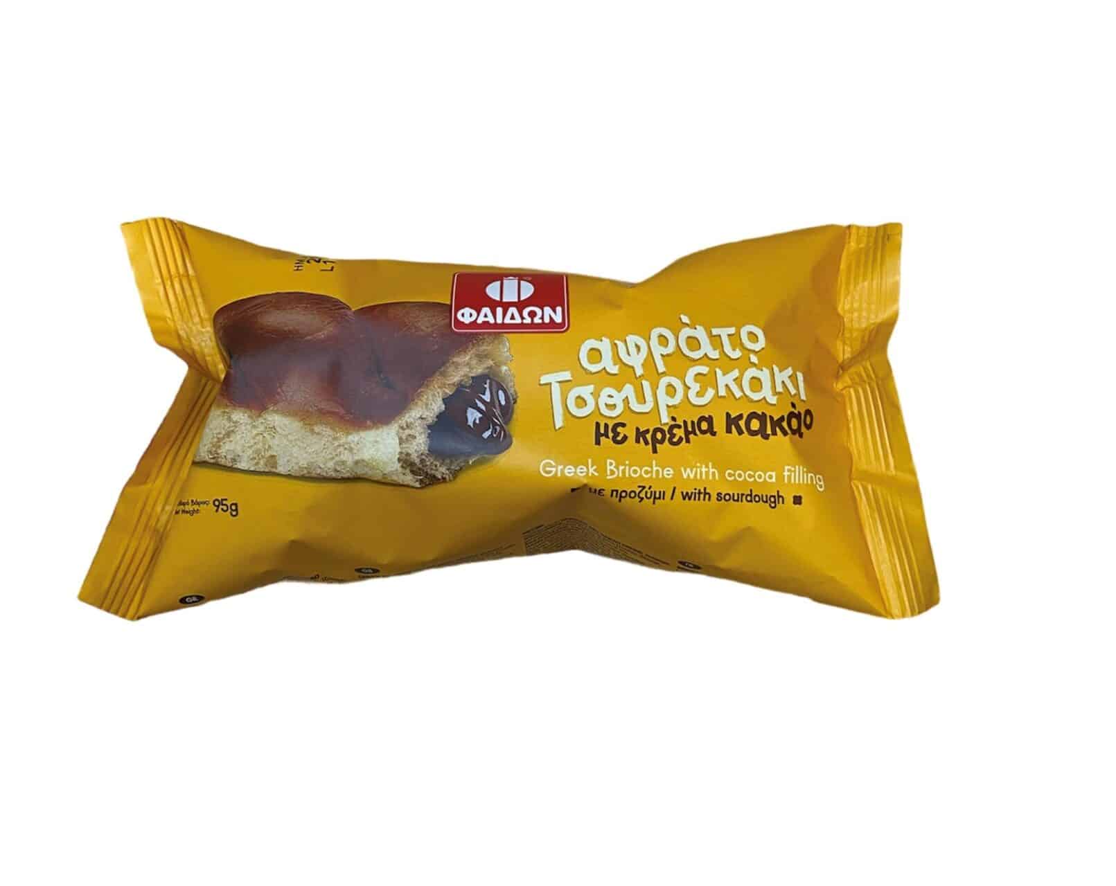 Faidon Tsourekaki with Cocoa Cream, in a convenient 95g size, is a delightful treat that marries the soft, fluffy texture of traditional Greek tsoureki with the creamy richness of cocoa cream. This sweet bread, a modern twist on a beloved classic, offers a mouth-watering experience, blending the aromatic flavours of tsoureki with the decadent smoothness of cocoa cream filling.