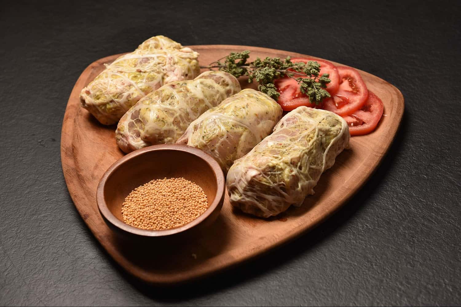 Εξαιρετική λιχουδιά από ζουμερό φιλέτο στήθος και φιλέτο μπούτι Ελληνικής εκτροφής μαριναρισμένο με οικογενειακή συνταγή με πλούσια γεύση. Τυλίγεται σε χοιρινή ή αρνίσια λεπτή μπόλια. Συσκευάζεται σε vacuum των 4 τεμαχίων.