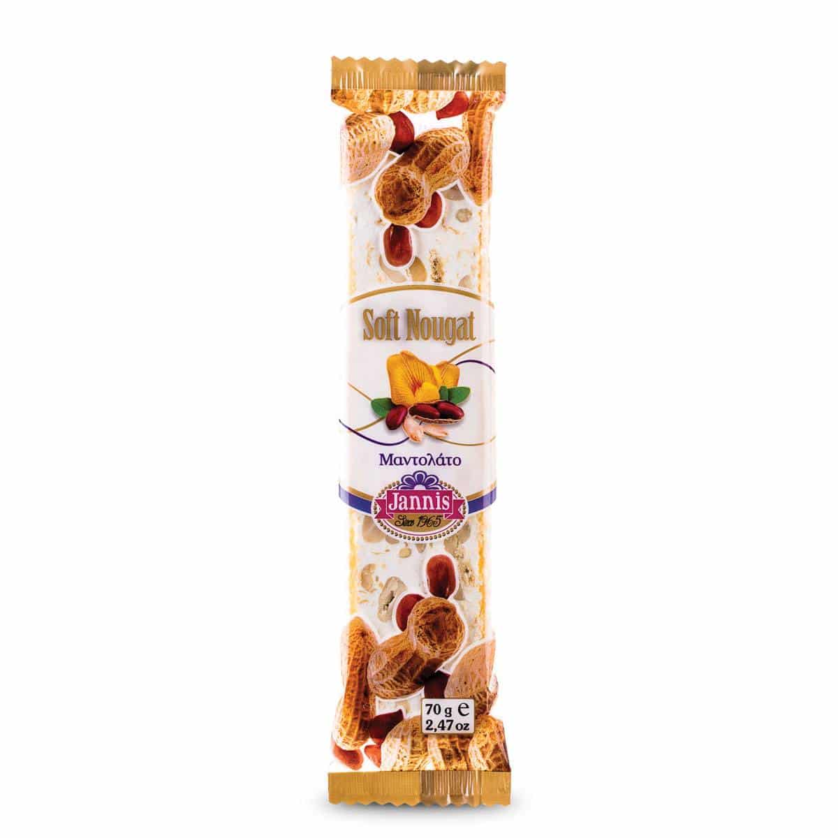 Jannis Soft Nougat with Peanuts, available in a 70g package, is a traditional Greek confectionery that combines the rich, chewy texture of nougat with the satisfying crunch of peanuts. Made with high-quality ingredients, this soft nougat is perfect for enjoying as a sweet treat anytime.