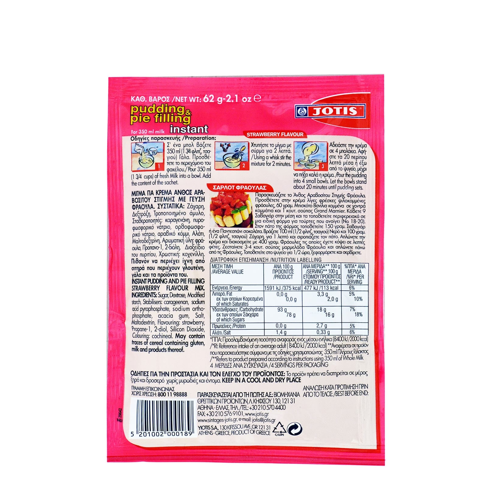 Jotis Instant Pudding Strawberry / Γιώτης Άνθος Αραβοσίτου Στιγμής Φράουλα 62g