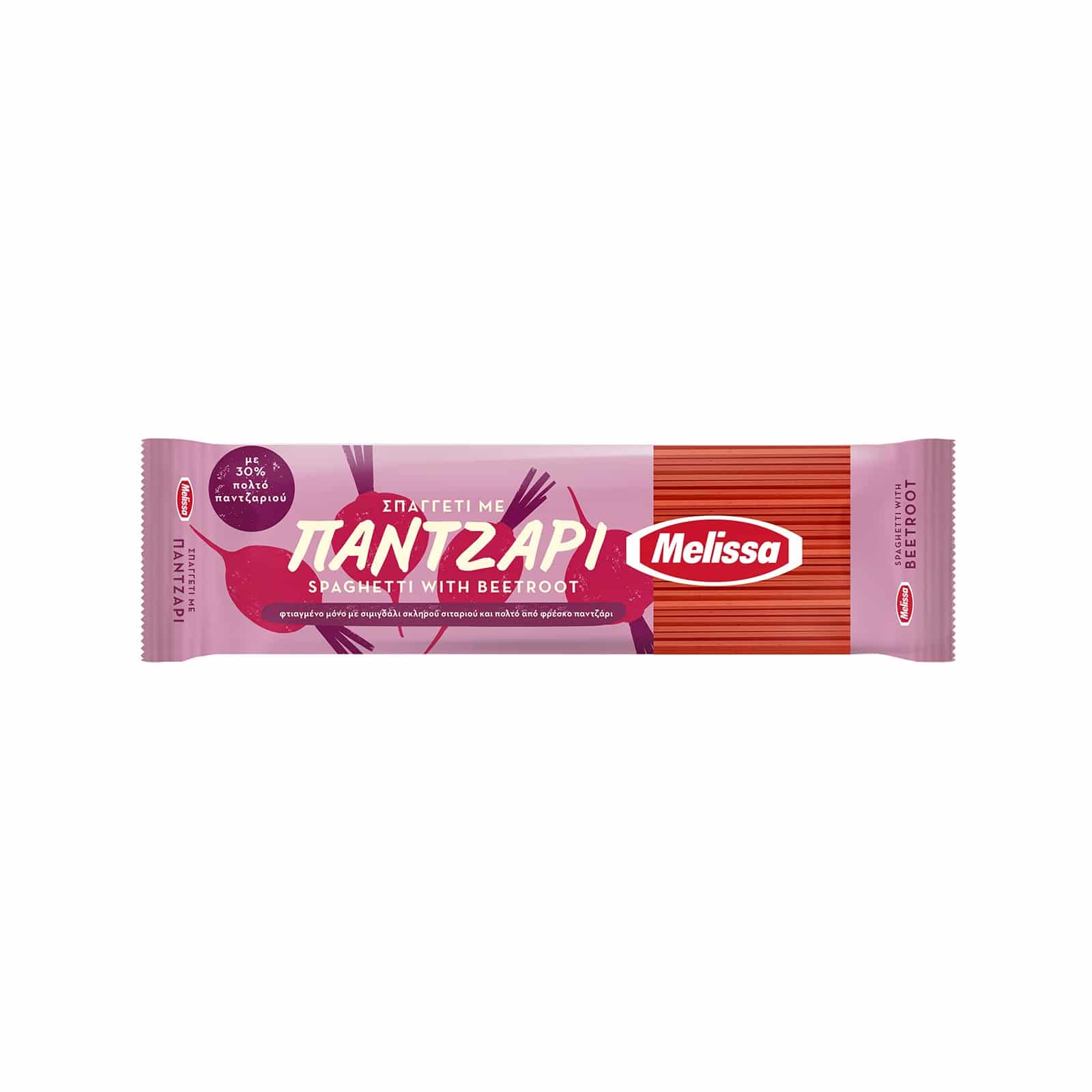 Spaghetti with beetroot. Made with durum wheat semolina and 30% beetroot pulp. With delicious taste and nutritional benefits. They are a source of protein and are low in fat and are suitable for vegans.