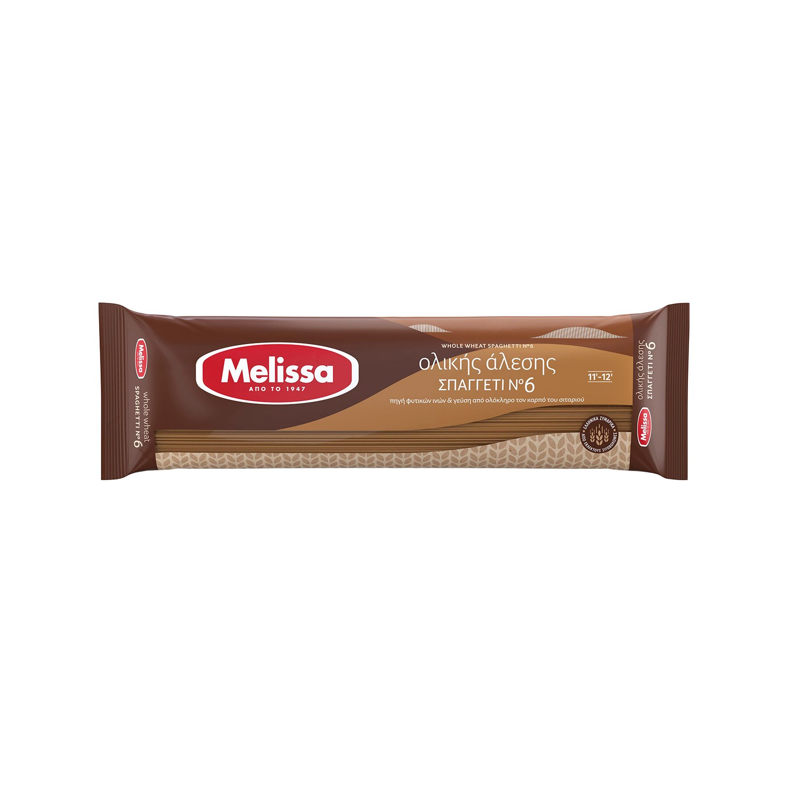 Το αγαπημένο όλων σπαγγέτι No6 φτιαγμένο και από αλέυρι ολικής άλεσης για να το απολάυσετε σκέτο με τυρί ή με μία απλή σάλτσα φρέσκιας τομάτας. Τα ζυμαρικά Melissa Oλικής Aλέσης φέρνουν κοντά σας όλα τα οφέλη μιας υγιεινής και ισορροπημένης διατροφής. Έχουν πλούσια γεύση καθώς παρασκευάζονται από ολόκληρο τον καρπό του σιταριού και είναι πηγή φυτικών ινών. Αποτελούν πηγή πρωτεινών, πηγή φυτικών ινών και είναι χαμηλά σε λιπαρά.