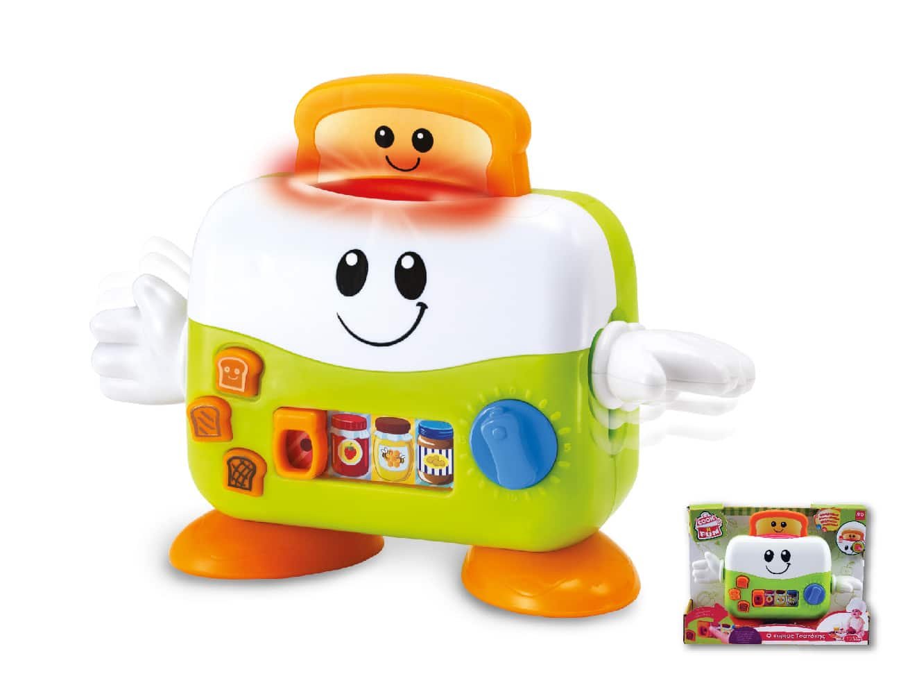 Παιδική τοστιέρα με ήχους και μελωδίες. Σπρώξτε το ψωμί, πατήστε το κουμπί και το τόστ είναι έτοιμο! Με κουμπιά για 3 διαφορετικές γεύσεις, 2 για τύπους ψησίματος, χρονοδιακόπτη + φως led. Μιλάει ελληνικά.