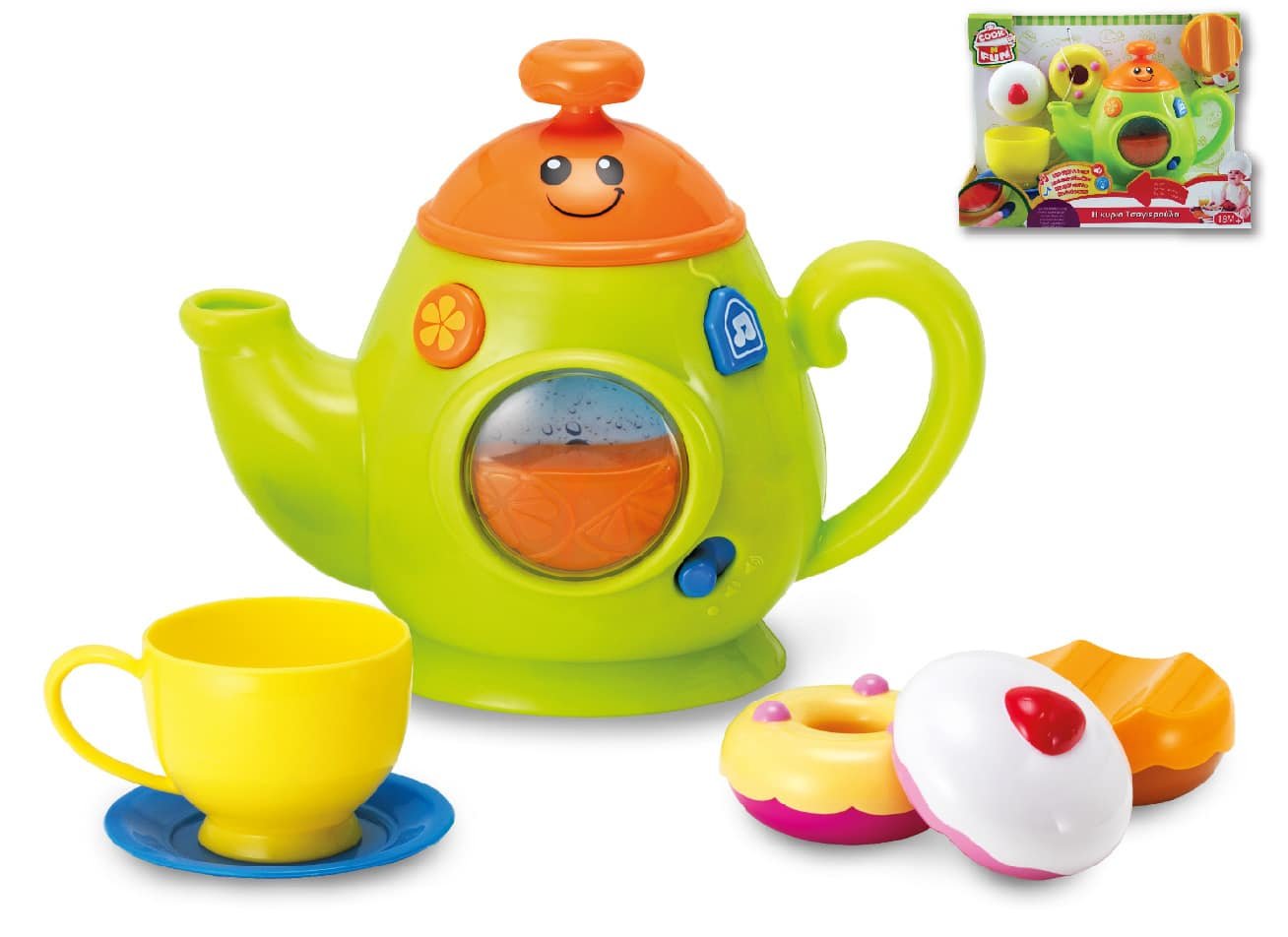 Πολύχρωμο σετ τσαγιού με φώτα που αναβοσβήνουν. Με κουμπιά για ήχους και μελωδίες Με σετ από πολύχρωμα γλυκίσματα. Μιλάει ελληνικά