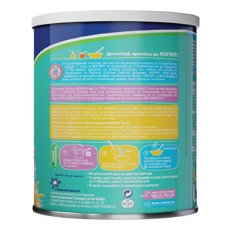 Η Φρουτόκρεµα 5 Φρούτα ΝΟΥΝΟΥ µε σιτάλευρο και γάλα, είναι εµπλουτισµένη µε απαραίτητες βιταµίνες, σίδηρο και µεταλλικά στοιχεία. Με συνδυασµό 5 φρούτων (µήλο, µπανάνα, πορτοκάλι, βερίκοκο και αχλάδι), είναι γευστική και εύπεπτη.