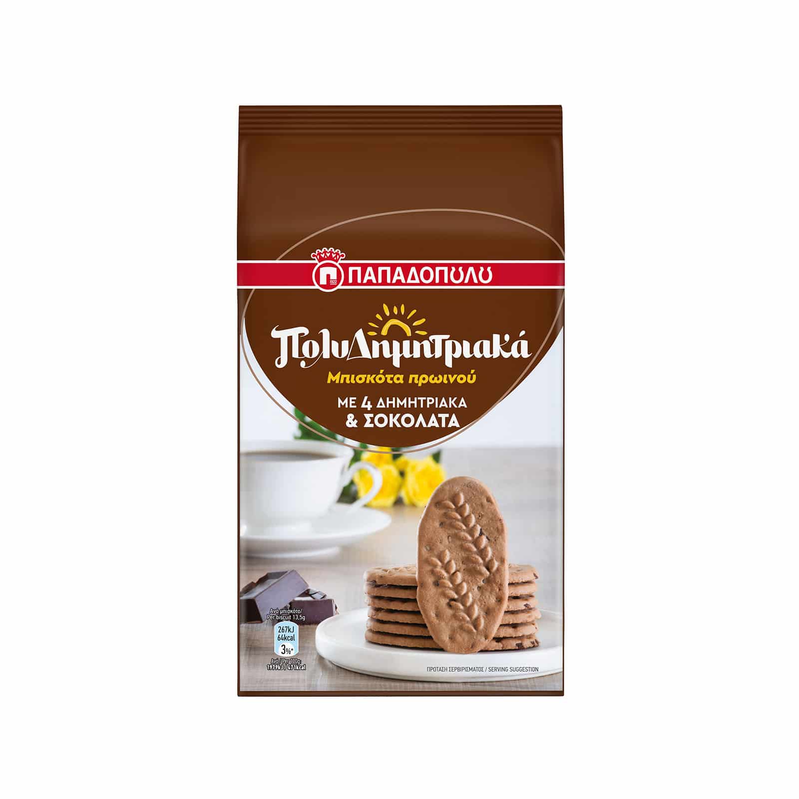 Τα Πολυδημητριακά μπισκότα ΠΑΠΑΔΟΠΟΥΛΟΥ με δημητριακά ολικής αλέσεως μπορούν να αποτελέσουν μέρος ενός ισορροπημένου πρωινού το οποίο θα σας γεμίσει ενέργεια. Τέσσερα δημητριακά, σιτάρι ολικής άλεσης, σίκαλη, βρώμη και κριθάρι, ενώθηκαν με πλούσια φρούτα, απολαυστική σοκολάτα και μυρωδάτο κακάο, θρεπτικό γάλα και απαραίτητο ασβέστιο, για να δημιουργήσουν ένα μπισκότο που κλείνει μέσα του όλη τη θρεπτική αξία των δημητριακών, φυτικές ίνες, βιταμίνες και ιχνοστοιχεία, για να απολαμβάνετε στο πρωινό σας τα οφέλη της ΠΟΛΥ…ισορροπημένης και ΠΟΛΥ…γευστικής διατροφής.