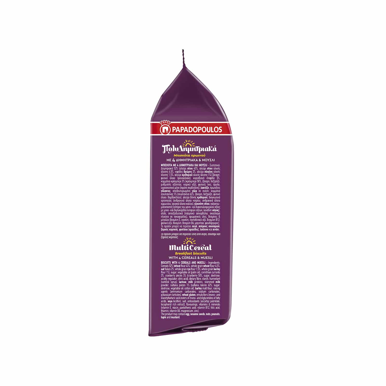 PAPADOPOULOS Multicereal biscuits with wholegrain cereal can form part of a balanced breakfast, which will give you the necessary energy to start the day off right. Four cereals โwheat flour, rye, oats and barleyโ are combined with luscious fruit, exquisite chocolate, aromatic cocoa, nutritious milk and indispensable calcium, to create a cookie that captures all the nutritional value of cereal, fibers, vitamins and minerals, so that you can enjoy the benefits of a MULTI-balanced and MULTI-delicious diet.
