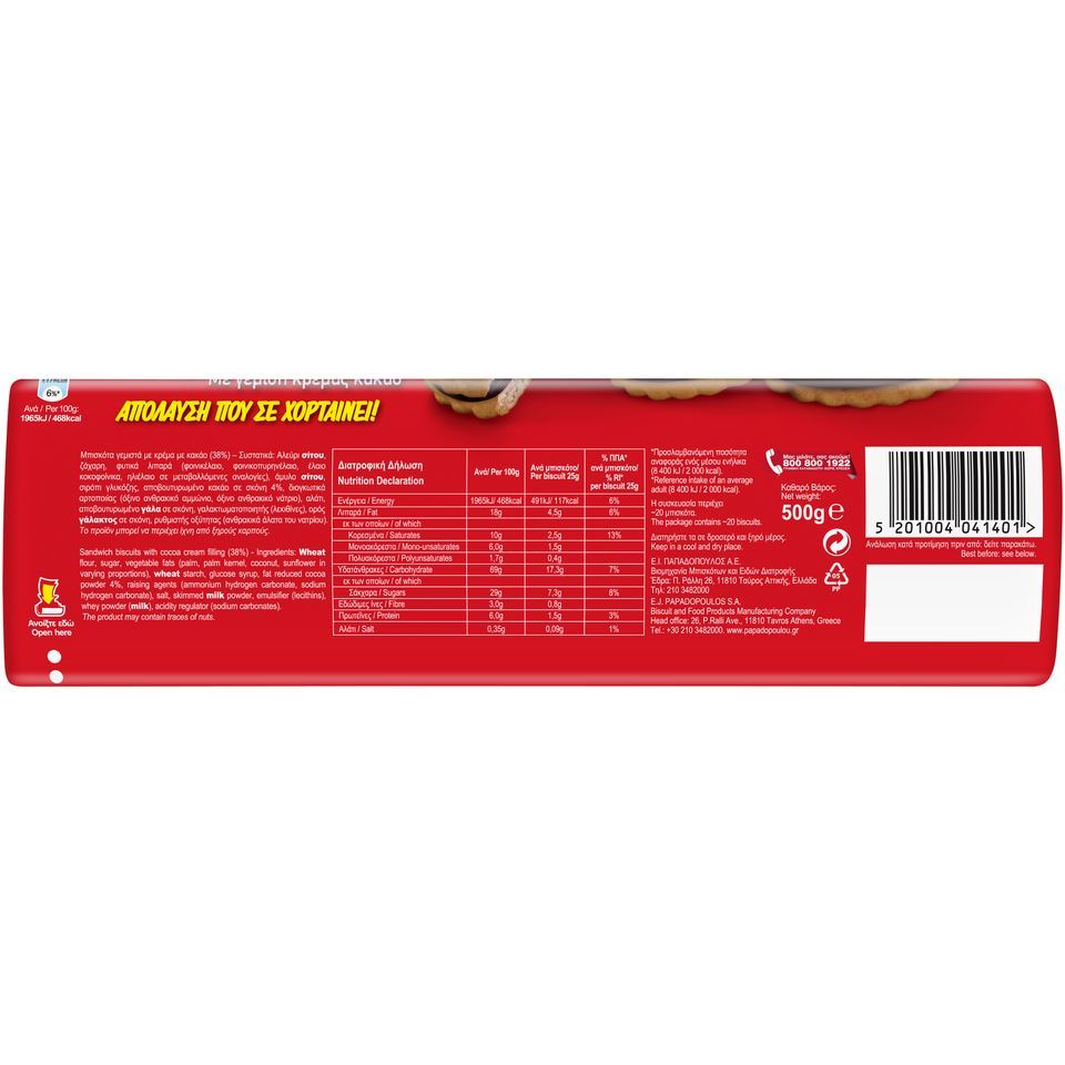 Papadopoulou Super Rondo Chocolate Biscuits, available in a generous 500g pack, are a delight for anyone seeking a truly indulgent biscuit experience. These biscuits, known for their luscious cocoa cream filling, offer a satisfying treat that’s hard to resist.