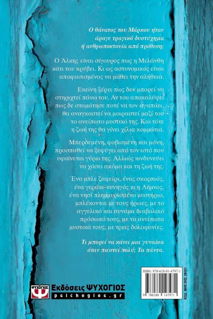 Ένα μπλε ζαφείρι, ένας σκορπιός, ένα γεράκι-κυνηγός κι η Λήμνος, ένα νησί πλημμυρισμένο μυστήριο, μπλέκονται με τους ήρωες, με το αγγελικό και συνάμα διαβολικό πρόσωπό τους, με τα ανείπωτα μυστικά τους, με τρεις δολοφονίες.