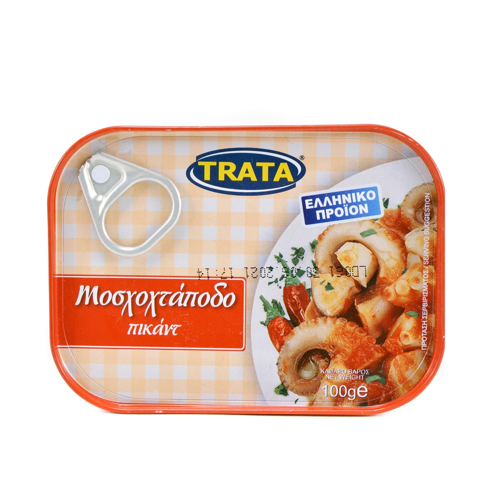 Το μοσχοχτάποδο TRATA σε πικάντικη σάλτσα πλένεται προσεκτικά, κόβεται σε κομμάτια και αφού ελεγχθεί σχολαστικά τοποθετείται στην κονσέρβα. Στην συνέχεια προσθέτουμε την αντίστοιχη πικάντικη σάλτσα τομάτας με την συνοδεία μυρωδικών και την καυτερή πιπεριά.